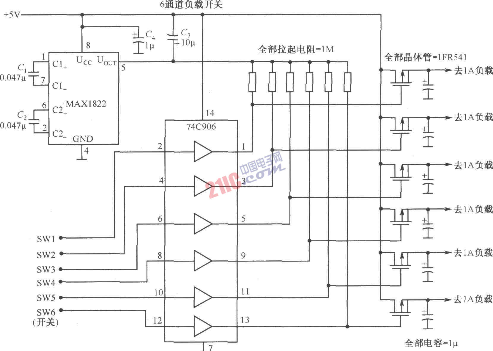由MAX1822和74C906構(gòu)成的1~6通道負(fù)載開關(guān)電路如圖所示。MAX1822是電荷泵開關(guān)電源,其輸入電壓可在3.5~16V范圍內(nèi)選擇,輸出電壓為11V,可以驅(qū)動低阻N溝道MOSFET。74C906是六反相器,SWl~SW6 6個開關(guān)信號可以同時饋送,也可以單獨(dú)或隨意組合,這要根據(jù)負(fù)載開關(guān)的工作狀態(tài)要求而定。