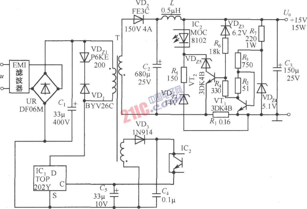 TOP202Y構(gòu)成的15V、1A恒功率型開關(guān)電源電路