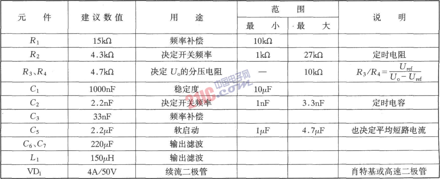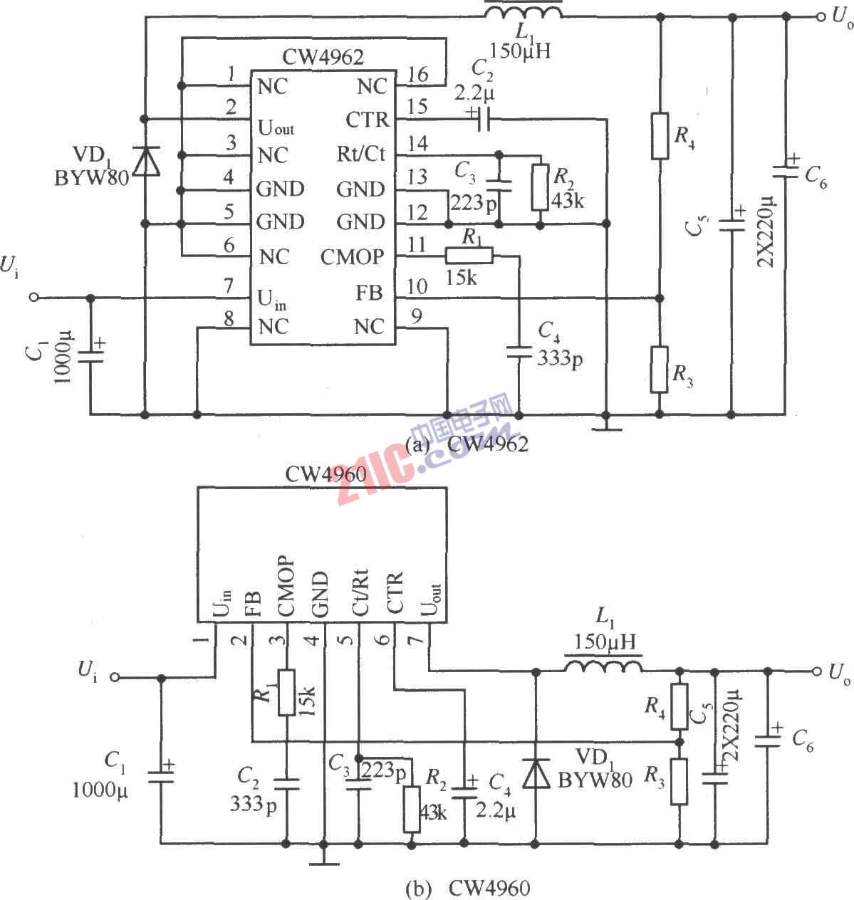 如圖所示是CW4962/CW4960的典型應(yīng)用電路。該電路最大輸入電壓為50V,輸出電壓可以5V調(diào)至40V。輸入直流電壓的獲得可以用工頻變壓器從交流220V降壓獲得,也可以用單端反激式開(kāi)關(guān)穩(wěn)壓器獲得。外圍元件的選擇如下表所示。