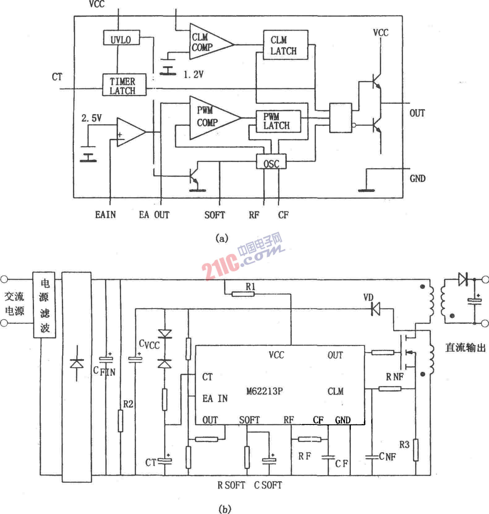 圖(a)所示為M62213FP的內(nèi)部結(jié)構(gòu)框圖。M62213FP是一種高速開關(guān)電源控制器。它由振蕩器、PWM比較器、誤差放大器、輸出電路、過電壓保護(hù)兼定時(shí)閉鎖電路、過電流保護(hù)電路以及軟啟動(dòng)電路等組成。開關(guān)工作頻率為700kHz,輸出電流峰值為±1A,采用推拉輸出電路,啟動(dòng)前電路的電流很小,典型值為130μA,啟動(dòng)開始與停止時(shí)電壓差較大,啟動(dòng)開始電壓為12.5V,啟動(dòng)停止電壓為8.3V,這樣可減小輸入平波電容。片內(nèi)具有高速限流、過壓兼定時(shí)閉鎖、死區(qū)控制兼軟啟動(dòng)、光電耦合器直接激勵(lì)的反饋用誤差放大器、防止低電壓時(shí)輸出誤動(dòng)作等功能電路。外接很少元件,就可構(gòu)成功能較為完善的開關(guān)穩(wěn)壓電源。