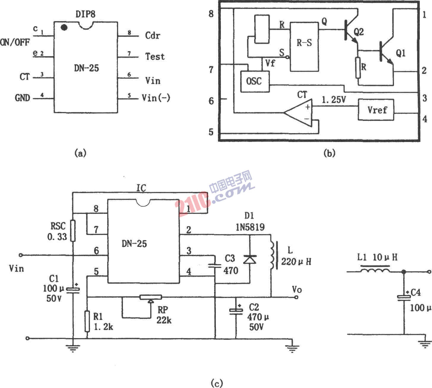如圖所示為由DN-25集成電路的開關(guān)穩(wěn)壓電源。DN-25是單片開關(guān)型穩(wěn)壓電源器件,適合制作中等輸出電流、寬調(diào)壓范圍的穩(wěn)壓電源。它的主要性能指標(biāo)如下:輸入電壓VIN=3~40V,輸出電壓Vo=1.25~24V(連續(xù)可調(diào)),最大輸出電流IOM=1A,最大輸出功率POM=36W,負(fù)載短路限制電流IOSH≤1.1A。DN-25采用8腳雙排直插式封裝(DIP-8),其內(nèi)部電路主要包括:(1)振蕩器(OSC);(2)R-S觸發(fā)器;(3)輸出開關(guān);(4)電壓基準(zhǔn)(VREF=1.25V)和比較器。DN-25內(nèi)部振蕩器的振蕩頻率f由③腳所接入的定時電容CT決定,f=1/CT。