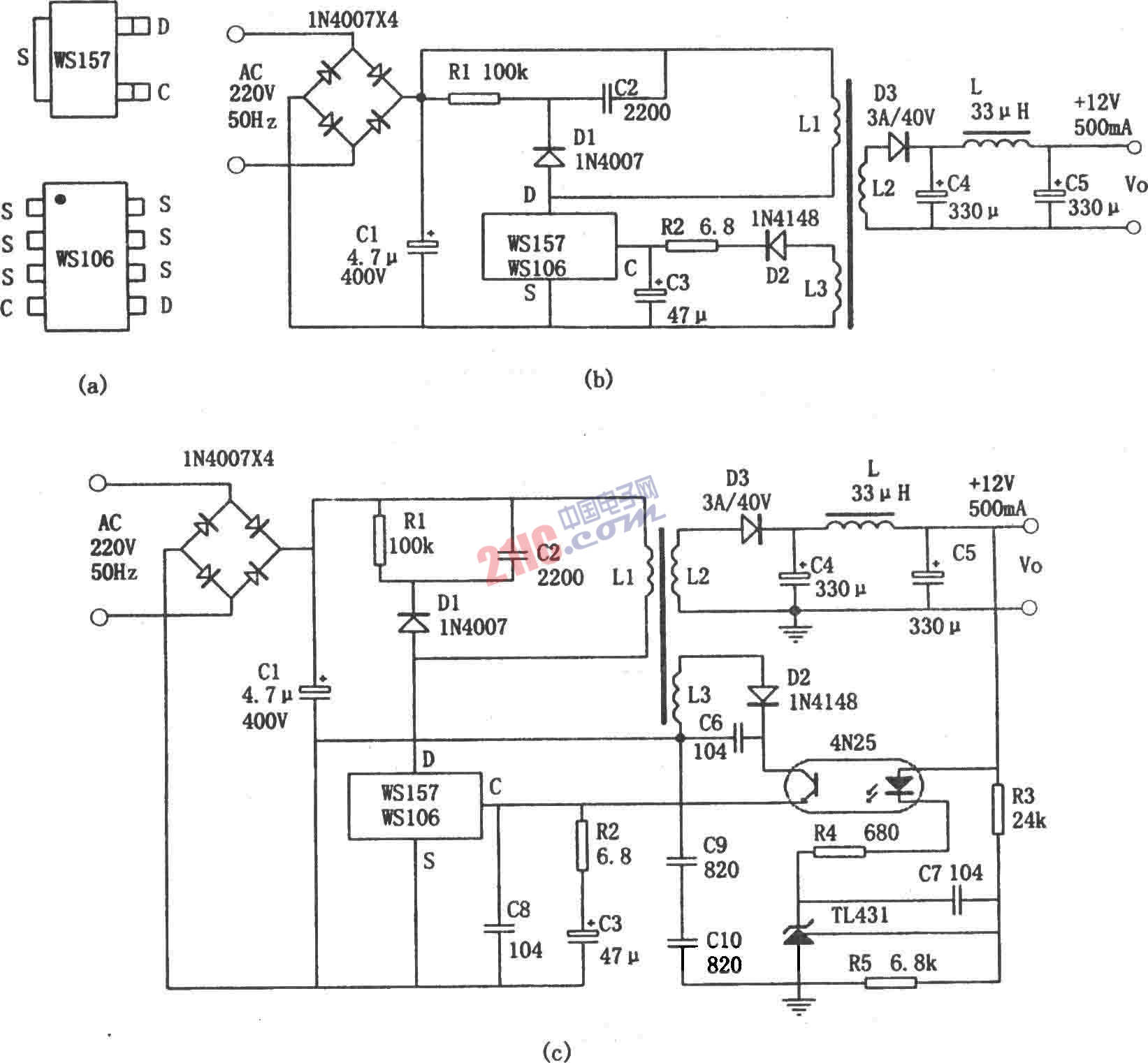 如圖所示為用WS157或WS106小功率微型開關(guān)穩(wěn)壓電源。WS157或WS106是近年來新近開發(fā)的一種穩(wěn)壓式開關(guān)電源控制器件,內(nèi)部將控制電路和功率開關(guān)管集成到同一個芯片上,具有PWM控制、過流過熱等多種檢測保護(hù)功能,外部僅需接合適的開關(guān)變壓器和少量元件就能正常工作。用它制成的穩(wěn)壓電源特點(diǎn)是直接將交流市電(220V)轉(zhuǎn)換成低壓直流,且體積小巧,制作簡單。WS157的功率為18W,WS106功率為12W。