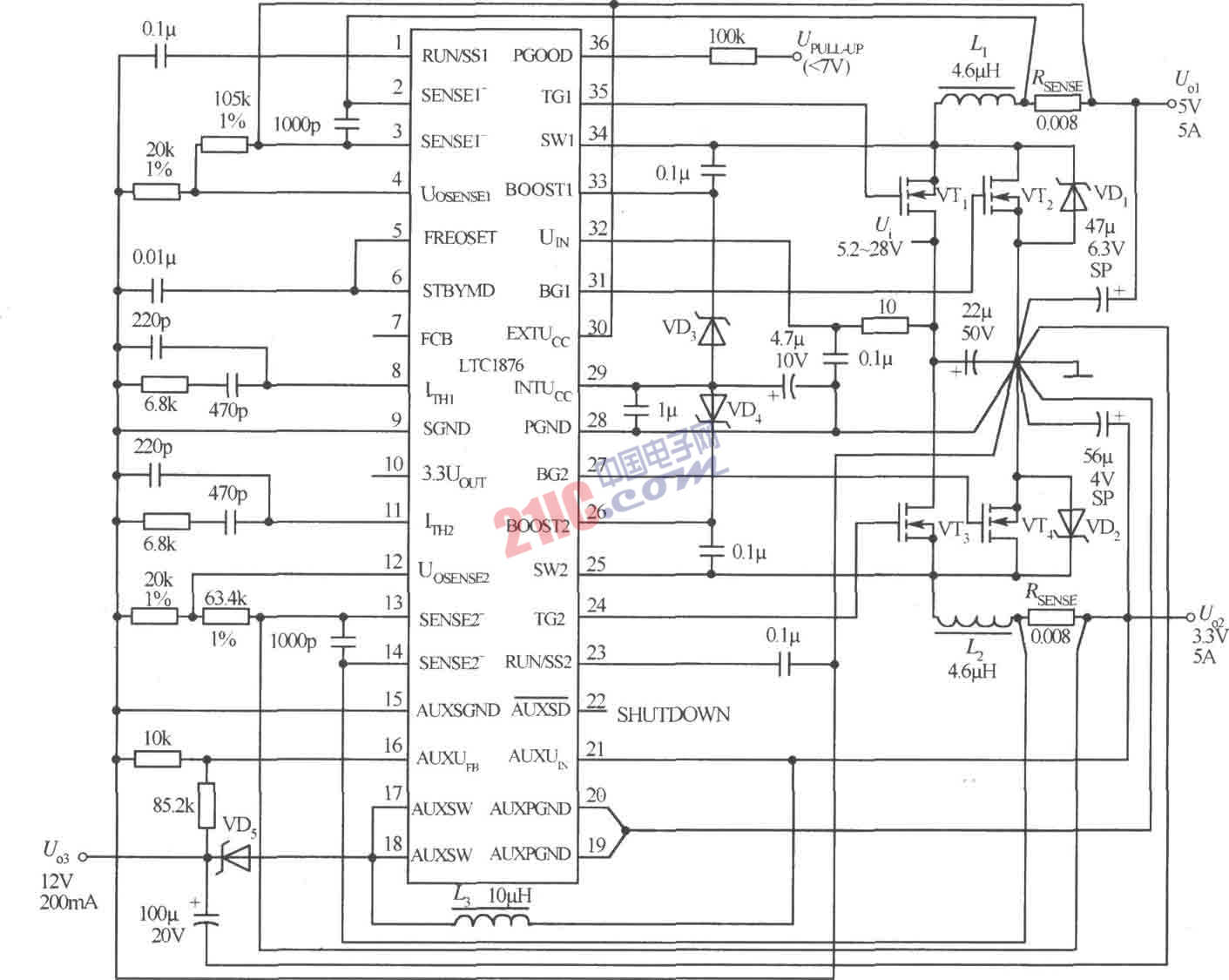 高效三輸出電壓5V/3.3V,12V/200mA電源電路(LTC1876)