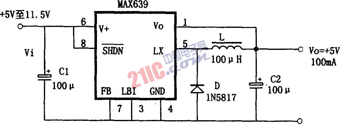 如圖所示為由MAX639構(gòu)成的+5V固定輸出的降壓式變換電源。MAX639是一種高效率、降壓式直流/直流變換器。輸入電壓的范圍在5.5V至11.5V,輸出為+5V固定電壓或可調(diào)電壓,輸出電流為100mA,轉(zhuǎn)換效率高達(dá)90%以上,具有低電池電壓檢測(cè)和工作/關(guān)斷模式控制功能。