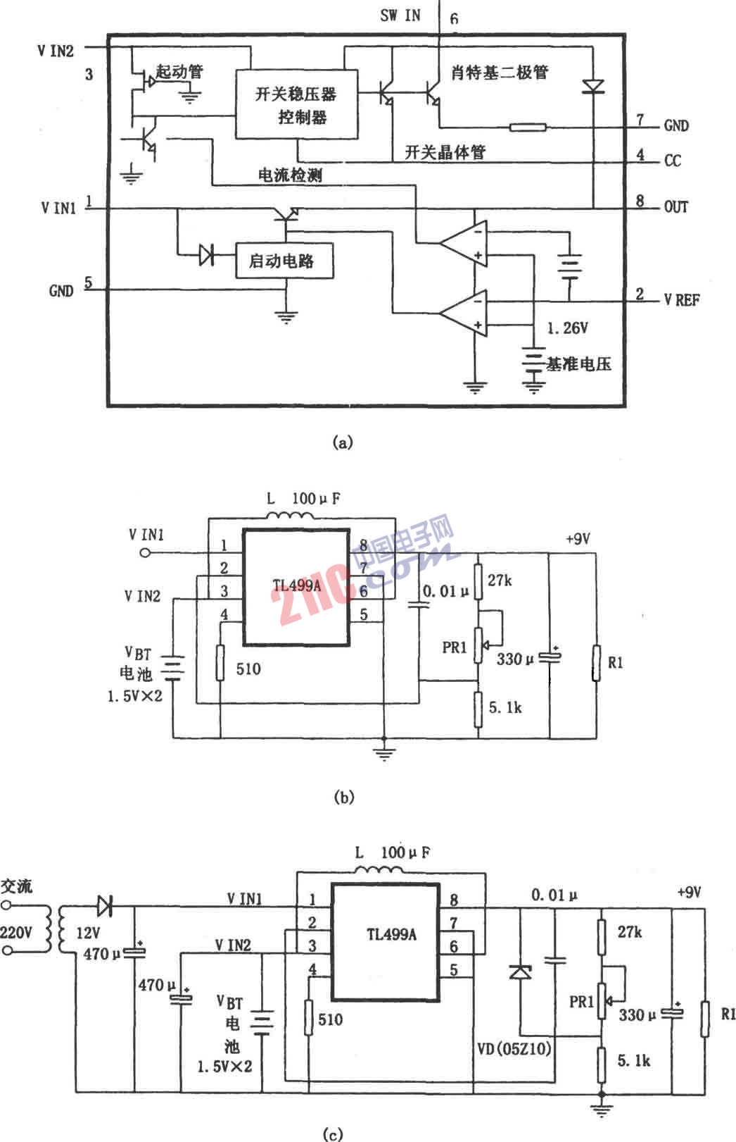圖(c)所示為采用TL499A構(gòu)成的電池后備電源電路。若輸入端VIN1(1腳)加直流電壓,就可獲得9V輸出電壓。它工作于線性穩(wěn)壓器狀態(tài),噪聲非常小,但前提是輸入電壓VIN1應(yīng)比輸出電壓VOUT高出1V。在圖(b)所示電路中,TL499A 1腳的輸入電壓VIN1可由交流220V通過(guò)變壓整流來(lái)提供,作為本電源電路的主要供電電壓。若VIN1為10V以上,就工作于線性穩(wěn)壓器狀態(tài);若輸入電壓VIN1低于l0V,就工作于開(kāi)關(guān)穩(wěn)壓器狀態(tài),此時(shí)由電池通過(guò)TL499A③腳供電,經(jīng)升壓變換后輸出。停電時(shí)電池作為后備電源,這樣可方便構(gòu)成不間斷電源。線性穩(wěn)壓器與開(kāi)關(guān)穩(wěn)壓器之間的轉(zhuǎn)換在TL499A的內(nèi)部自動(dòng)進(jìn)行,雖然輸出電壓有些變動(dòng),但只有2%左右,一般用途不受影響。輸入電壓VIN1最高為32V。