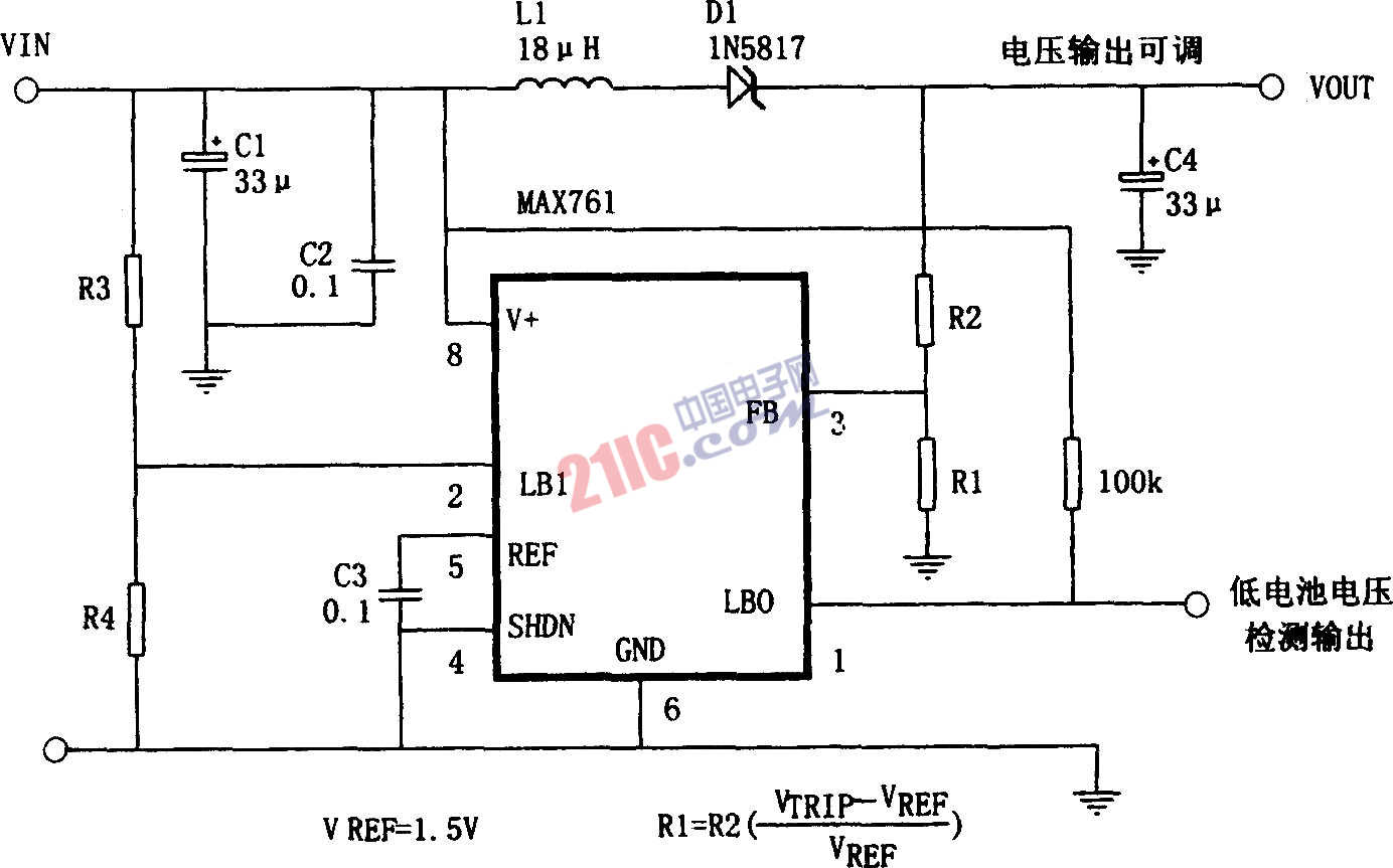 如圖所示為由高效、低功耗升壓直流變換器MAX761和幾只外圍元件構(gòu)成的輸出電壓可調(diào)的變換電源。其輸出電壓由R2和R1的比值決定,可按公式Vo=(1+R2/Rl)×VREF計(jì)算,VREF=1.5V。