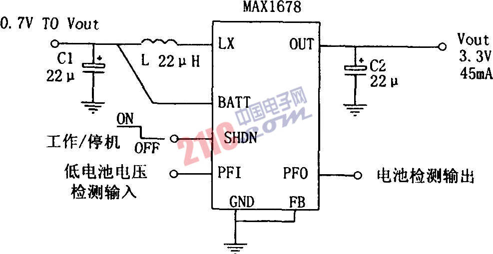如圖所示為適用于尋呼機(jī)的高效率單電池升壓電源。它是由MAX1678和3只外圍元件構(gòu)成。MAX1678是一種專為l至2節(jié)電池供電的低功耗應(yīng)用而設(shè)計(jì)的。它采用超小型8引腳,μMAX封裝。不需外接MOSFET和肖特基二極管,降低了系統(tǒng)的成本和體積成本。芯片內(nèi)部具有電池欠壓檢測(cè)電路、噪聲抑制電路。MAX1678采用專有的恒峰電流控制原理,使其不僅保持了傳統(tǒng)PWM轉(zhuǎn)換器的低靜態(tài)電流,而且具有高滿負(fù)載效率及低輸出電壓紋波。用它組成的升壓轉(zhuǎn)換電源,可工作于0.7V的輸入電壓,輸出電壓預(yù)設(shè)在3.3V。其特點(diǎn)是:效率在90%以上;輸入電壓為0.85V即可啟動(dòng);45mA的輸出電流(1.2V升到3.3V);靜態(tài)電流37μA,停機(jī)電流2μA;體積小、外部元件少、結(jié)構(gòu)簡(jiǎn)單。