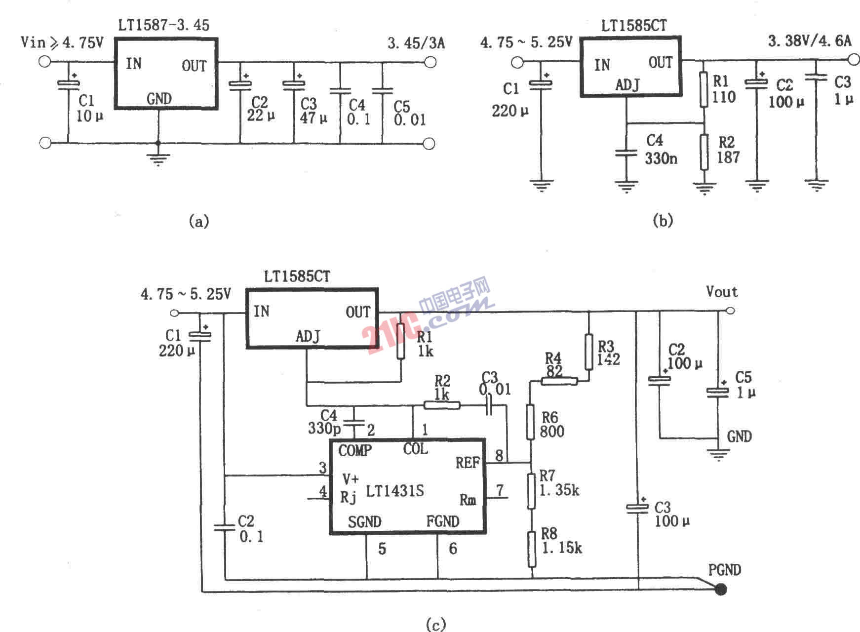 圖(a)是采用LT1587-3.45構(gòu)成的微處理機電源電路。圖(b)是采用LT1585構(gòu)成的輸出電壓可調(diào)的穩(wěn)壓電源。圖(c)是采用LT1584和LT1431構(gòu)成的微機電源。LT1584、LTl585、LT1587的輸出電流為7A、4.6A、3A,是最適用于驅(qū)動微處理機的穩(wěn)壓器,具有高速過度響應(yīng)特性,負載調(diào)整率為0.5%,內(nèi)有熱擊穿保護電路。基本應(yīng)用電路非常簡單,固定輸出電壓時,只要在輸入與輸出端各接l只電容;可調(diào)輸出電壓時,再接上用于設(shè)定輸出的2只電阻即可,輸入輸出的電容容量可非常小。