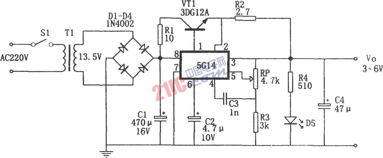 如圖所示為一種實用的3~6V可調電源。本電源以集成穩(wěn)壓器5G14為核心,外加3DG12A晶體 管進行電流擴展,構成一個輸出電壓為3~6V、額定輸出電流為160mA的串聯(lián)型穩(wěn)壓電源,其紋波系數(shù)<1mV,適用于收音機、小型錄音機的供電。