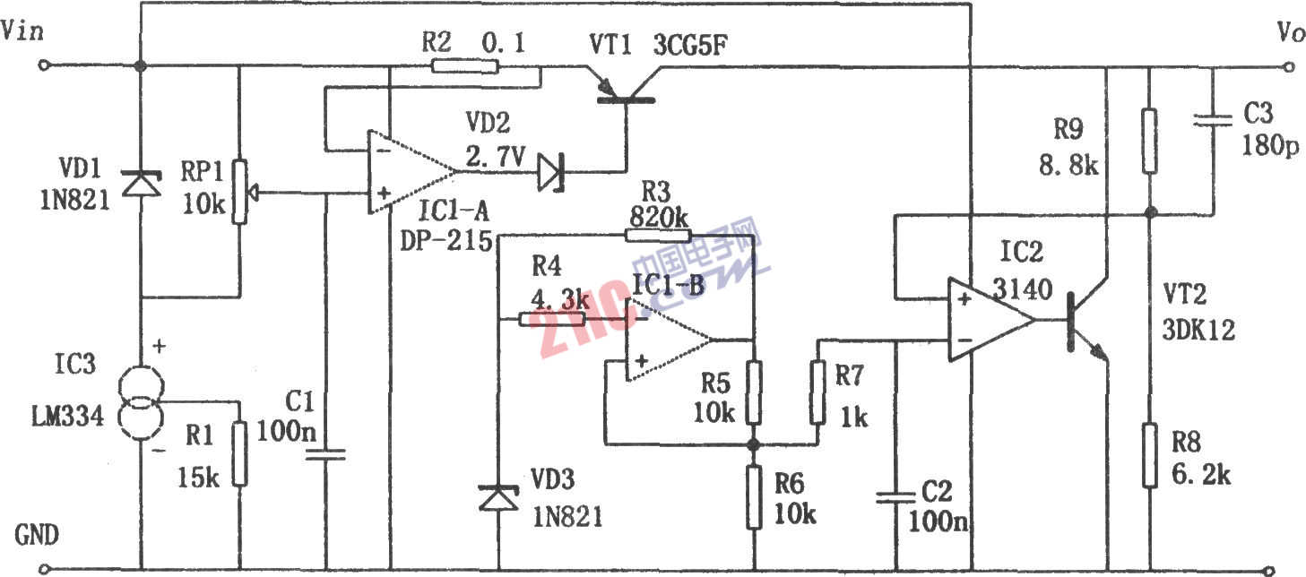 如圖所示為一種配合開關(guān)電源進(jìn)行工作的線性穩(wěn)壓電源。其特點(diǎn)是:高效率,低壓差;具有濾除高頻脈動(dòng)電壓和瞬間突變電壓的能力;最適合于小負(fù)載的需求;具有限流功能。圖中,由VD3、IC1-b等元件產(chǎn)生基準(zhǔn)電壓。R8、R9構(gòu)成電壓取樣電路,對(duì)電源的輸出電壓進(jìn)行采樣。IC2和VT2等元件構(gòu)成誤差放大和并聯(lián)電壓調(diào)整電路。通過IC2對(duì)基準(zhǔn)電壓與取樣電壓的比較放大,驅(qū)動(dòng)調(diào)整管VT2,進(jìn)而穩(wěn)定輸出電壓。由VD1、IC3、VD2、IC1-a、VT1等元件構(gòu)成限流電路。VD1、IC3和RP1形成可調(diào)的限流基準(zhǔn)電壓,通過IC1-a對(duì)此基準(zhǔn)電壓與R2(輸出電流的取樣電阻)上產(chǎn)生的取樣電壓進(jìn)行比較放大,形成誤差電壓。用該誤差電壓控制調(diào)整管VT1的工作狀態(tài),從而穩(wěn)定和限制輸出電流。