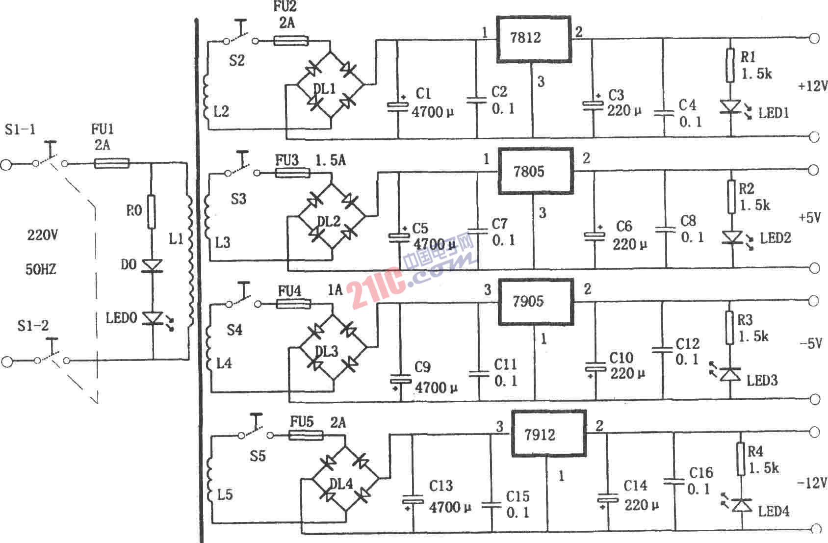 如圖所示為多路輸出的穩(wěn)壓電源電路。該電路利用變壓器的4個(gè)次級(jí)繞組和7812、7805、7905、7912分別提供+12V、+5V、-5V和-l2V 4組相互獨(dú)立的輸出電壓。每組輸出電壓都有單獨(dú)的開關(guān)控制和輸出指示??勺鳛閷?shí)驗(yàn)用電源。