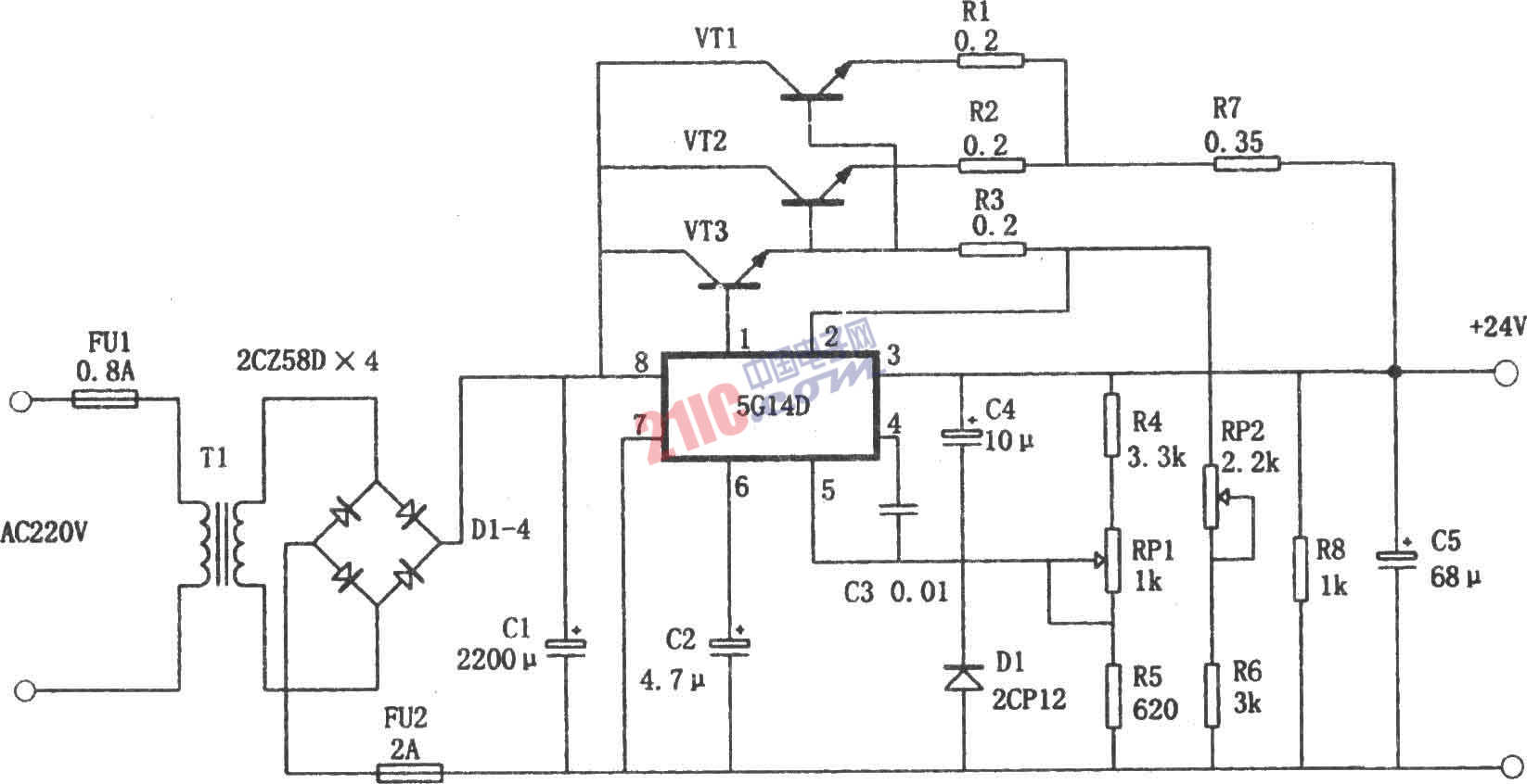 如圖所示為一種+24V、1.9A電源電路。它以國產的集成穩(wěn)壓器5G14D為核心,外接三只功率晶體管,使電源的輸出電流由5G14D本身的額定電流24mA,提高到1.9A。RP1用來微調輸出電壓,RP2用來調整過載電流保護點。本電源的主要技術特點:(1)輸入電壓:220V±22V,50Hz。(2)輸出電壓:24V,誤差≤±2%。(3)最大輸出電流:1.9A。(4)紋波電壓:≤24mV。(5)過載保護點:2.8A。