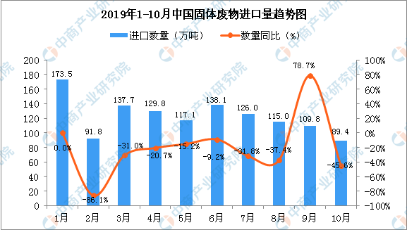 最新數(shù)據(jù)顯示,2019年10月中國固體廢物進(jìn)口量為89.4萬噸,同比下降45.6%。