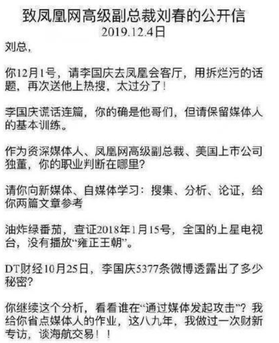俞渝在公開信中怒懟劉春,稱“你12月1號,請李國慶去鳳凰會客廳,用拆爛污的話題,再次送他上熱搜,太過分了!李國慶謊話連篇,你的確是他哥們,但請保留媒體人的基本訓練。”