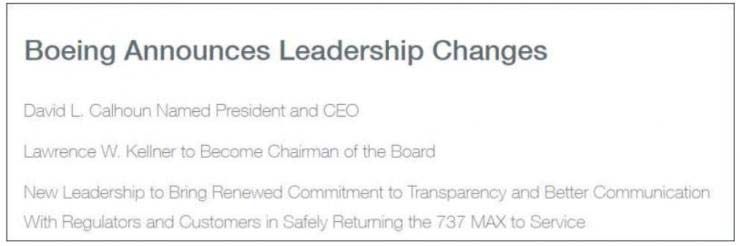波音公司在聲明中表示,公司董事會認(rèn)為,“領(lǐng)導(dǎo)層的變動對公司恢復(fù)信心是必要的,因為公司正在努力修復(fù)與監(jiān)管機構(gòu)、客戶和所有其他利益相關(guān)者的關(guān)系。”