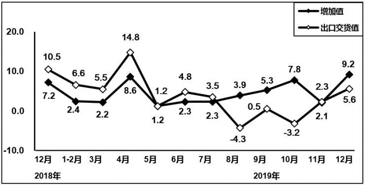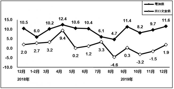 2019年,規(guī)模以上電子信息制造業(yè)增加值同比增長(zhǎng)9.3%,增速比上年回落3.8個(gè)百分點(diǎn)。12月,規(guī)模以上電子信息制造業(yè)增加值同比增長(zhǎng)11.6%,增速比上年提升1.1個(gè)百分點(diǎn)。