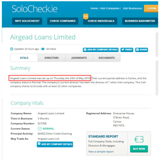 這家被證實(shí)為空殼的公司于2018年5月24日在愛爾蘭卡洛郡(County Carlow)注冊(cè)成立,只有一位出生于1992年的股東以及一位擁有100%股權(quán)的董事,根據(jù)其注冊(cè)新公司的申請(qǐng),其主要業(yè)務(wù)是貸款融資,可提供高達(dá)50萬歐元的貸款用于申請(qǐng)愛爾蘭投資居留計(jì)劃。這些信息被愛爾蘭當(dāng)?shù)貙iT提供公司信息的網(wǎng)站SoloCheck.ie上被披露: