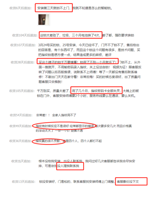 如下圖中的智能鎖續(xù)航問題和指紋識(shí)別問題,就有用戶表示不滿。更有用戶稱家里老人因指紋模糊容易出現(xiàn)識(shí)別不出的情況,部分用戶也對(duì)凱迪仕的上門安裝服務(wù)表示質(zhì)疑,曝光安裝師傅不專業(yè)和售后客服懈怠敷衍。