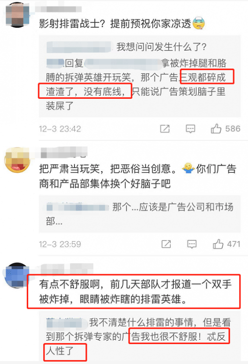 針對(duì)該內(nèi)容,網(wǎng)友義憤填膺,紛紛表示這是對(duì)排雷戰(zhàn)士的侮辱,且對(duì)企業(yè)撤掉廣告僅簡單發(fā)布聲明的處理表示不滿,不少網(wǎng)友質(zhì)疑凱迪仕對(duì)幽默有誤解,且認(rèn)為廣告違背人性倫理。許多網(wǎng)友批評(píng)其暴力冷血,沒有考慮在拆彈中犧牲的英雄家屬的心情,且對(duì)軍人群體和殘疾人群體沒有給予應(yīng)有的尊重。
