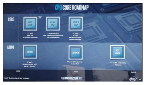 2019-2021年三年間,英特爾將每年推出一代高性能酷睿(Core)架構(當然也會用于至強),同時在2019-2023年間,將推出三代低功耗凌動(Atom)架構,重點當然是前者啦。