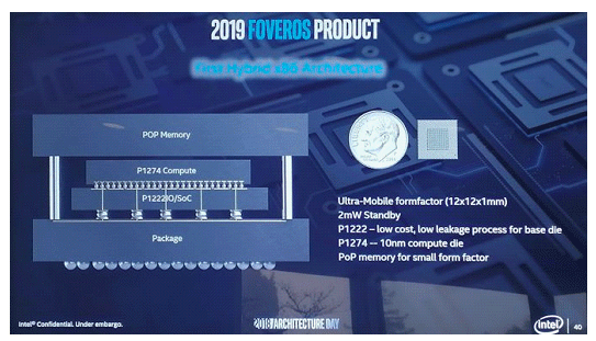 這款小巧的12x12封裝采用英特爾的Foveros技術(shù)構(gòu)建,采用22FFL IO芯片作為有源內(nèi)插器(active interposer),用TSV連接至10nm裸片,其中包含一個Sunny Cove核心和四個凌動(Tremont?)核心。這款小芯片比一美分硬幣還小,設(shè)計的待機功率為2mW。這種芯片似乎是為移動設(shè)備設(shè)計的。