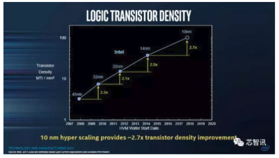 但是,需要注意的是,根據(jù)英特爾的公布的數(shù)據(jù)顯示,從英特爾的32nm開始到后面的22nm,每兩年的時(shí)間,晶體管密度(單位面積下晶體管的平均數(shù)量)的提升都超過了兩倍(32nm的晶體管密度是45nm的2.27倍)。而且從22nm升級(jí)到14nm,以及從14nm升級(jí)到10nm,對(duì)應(yīng)的晶體管密度則分別提升了2.5倍和2.7倍。