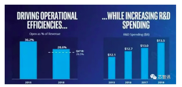 從英特爾的研發(fā)投入來看,多年來都在持續(xù)增長,2018年已達(dá)135億美元。根據(jù)IC Insights的數(shù)據(jù)顯示,2017年全球研發(fā)投入最多的15大半導(dǎo)體公司中,英特爾以約130億美元的研發(fā)投入排名第一,遠(yuǎn)超排名第二的高通(研發(fā)投入只有34.5億美元)。足見英特爾在半導(dǎo)體領(lǐng)域的研發(fā)投入之大。而這也正是英特爾能夠持續(xù)引領(lǐng)創(chuàng)新的一大保障。