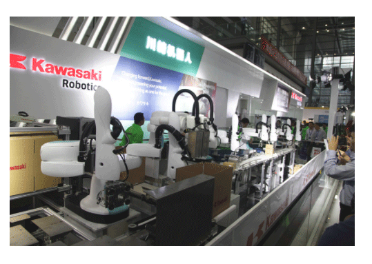 面向華南地區(qū)3C行業(yè)的龐大需求,川崎機器人的7臺雙臂協(xié)作機器人duAro紙板箱生產(chǎn)線精彩出展。采用川崎兩種型號共7臺duAro雙臂機器人作為生產(chǎn)線主體,實現(xiàn)了紙板箱的折疊、裝盒、折蓋、物流轉(zhuǎn)運裝箱和裝箱、碼垛等操作工藝,為電子產(chǎn)品包裝行業(yè)廣泛應(yīng)用?,F(xiàn)場力傳感綜合應(yīng)用單元、3D視覺自動拆垛單元等多套應(yīng)用更是各領(lǐng)風騷。