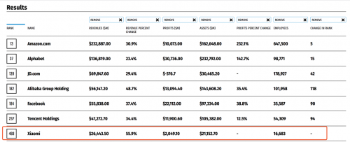 《財(cái)富》世界500強(qiáng)榜單,被視為全球最權(quán)威及最著名的企業(yè)排行榜。依據(jù)公司年度營收以及利潤來作為評選準(zhǔn)則。小米集團(tuán)2018年全年總營收1749億人民幣,凈利潤85.5億人民幣,位于榜單第468位,位于入榜的互聯(lián)網(wǎng)公司第7位。