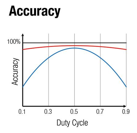 與斯坦梅茨(藍(lán)色)相比,伍爾特電子(紅色)模型在更廣泛的占空比范圍內(nèi)具有更高的精度。