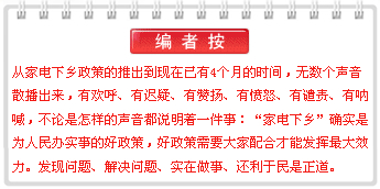 冰箱、洗衣機、手機、電腦、甚至汽車紛紛下到鄉(xiāng)鎮(zhèn)來,3、4個月過去了,農(nóng)民朋友認(rèn)可嗎?暢銷嗎?產(chǎn)品質(zhì)量怎樣、反響怎樣?