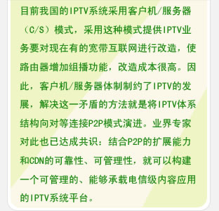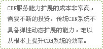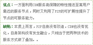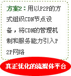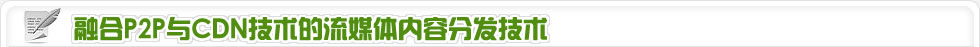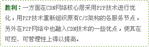 P2P與CDN技術(shù)的融合,一方面可以互補(bǔ)自身先天計(jì)算模型的缺陷,對(duì)CDN或者P2P傳統(tǒng)架構(gòu)進(jìn)行改造;一方面P2P的擴(kuò)展能力和CDN的可靠性、可管理性也可完美結(jié)合。這兩方面都為實(shí)現(xiàn)一個(gè)能夠承載電信級(jí)超大規(guī)模內(nèi)容分發(fā)傳送應(yīng)用的內(nèi)容分發(fā)平臺(tái)提供了機(jī)會(huì)。 |