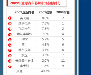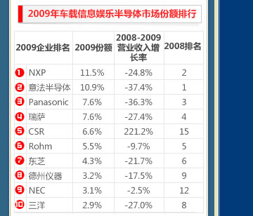 2009年全球汽車信息娛樂(lè)半導(dǎo)體市場(chǎng)排名出爐