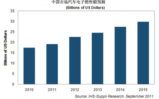 IHS iSuppli公司最新的研究報(bào)告顯示,2011年中國(guó)汽車(chē)電子市場(chǎng)銷售額預(yù)計(jì)將達(dá)到192億美元,比去年的175億美元增長(zhǎng)9.7%。接近兩位數(shù)銷售額增長(zhǎng)率顯示出中國(guó)汽車(chē)電子市場(chǎng)充滿活力。據(jù)預(yù)測(cè),2015年中國(guó)市場(chǎng)的汽車(chē)電子銷售額預(yù)計(jì)達(dá)到299億美元。 |