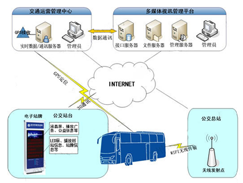 一塊智能公交站牌展現(xiàn)在我們面前看起來很簡單,其實(shí)這一系統(tǒng)背后需要強(qiáng)大的技術(shù)支持,相關(guān)技術(shù)包括GIS電子地圖、GPS衛(wèi)星定位、GPRS(CDMA)移動(dòng)通訊等。系統(tǒng)主要由公交運(yùn)營管理中心、多媒體視訊管理平臺(tái)、智能電子站牌三大部分組成,智能電子站牌包括LCD顯示屏、信息發(fā)布系統(tǒng)終端主機(jī)、3G通信模塊等連接到INTERNET,通過互聯(lián)網(wǎng)網(wǎng)絡(luò)實(shí)現(xiàn)信息遠(yuǎn)程發(fā)布和管理功能。