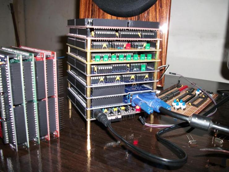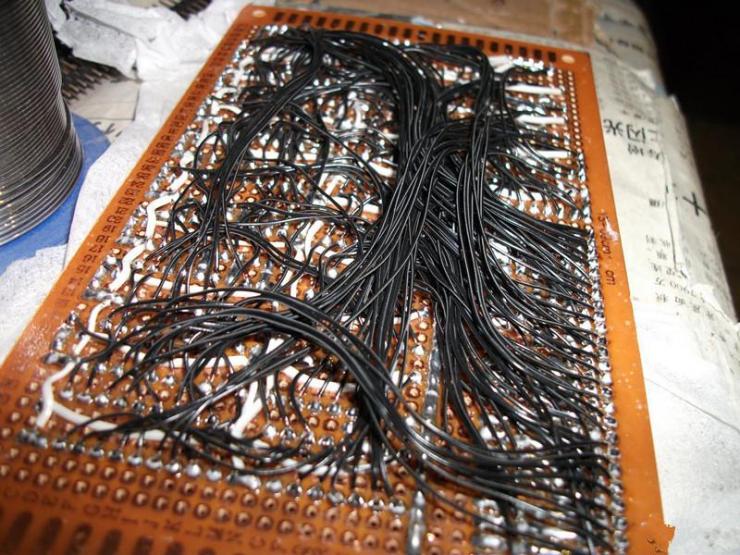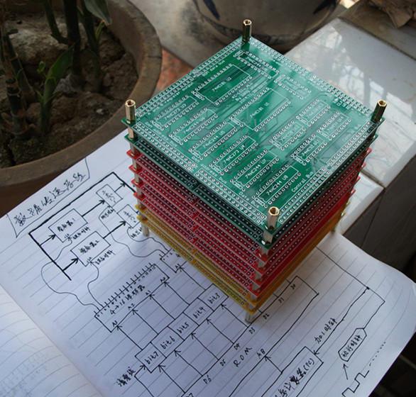 這個設計的技術牛人是一個游戲開發(fā)者,他從2007年就開始了這個計劃并命名為BMOW-1號,他的DIY電腦CPU面積約有450平方厘米,是個極其復雜的大塊頭:基礎是一塊Augat繞線板,在此之上已經(jīng)預先裝好了1250個針腳,需要手工給它們鍍金,然后連接2500條線,有些地方甚至要堆疊十層。