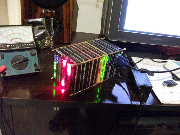 上面插滿了芯片,不過這些芯片不是真正意義上的CPU,他們一般是ram芯片,rom芯片,加法運算器芯片之類的芯片。這個綠色的板子宏觀上就是一個DIY電腦CPU,超級大的電腦CPU。