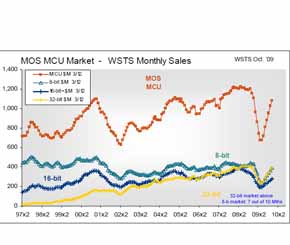 Geoff Lees表示:“整體的嵌入系統(tǒng)市場(chǎng)2008年是150億,到2009年變到120億。如下圖所示,與8位和16位的增長(zhǎng)曲線相比,可以看到32位在過去幾年里的增長(zhǎng)速度非???,過去5年增長(zhǎng)了一倍,它是一個(gè)強(qiáng)大的V型增長(zhǎng)。在過去10個(gè)月中有7個(gè)月32位是超過8位的。到10月底,就整體市場(chǎng)來說,32位下降了將近23%,而8位下降了將近27%。有趣的是,看一下單元數(shù)量,會(huì)發(fā)現(xiàn)8位的下降是26%,而32位的僅下降10%??梢钥吹?,從整體市場(chǎng)下降情況和單元數(shù)量來說,32位下降比較少,還是比較強(qiáng)勁的增長(zhǎng)勢(shì)頭,這就是為什么恩智浦半導(dǎo)體要把主要精力放到32位上去?!?/p>