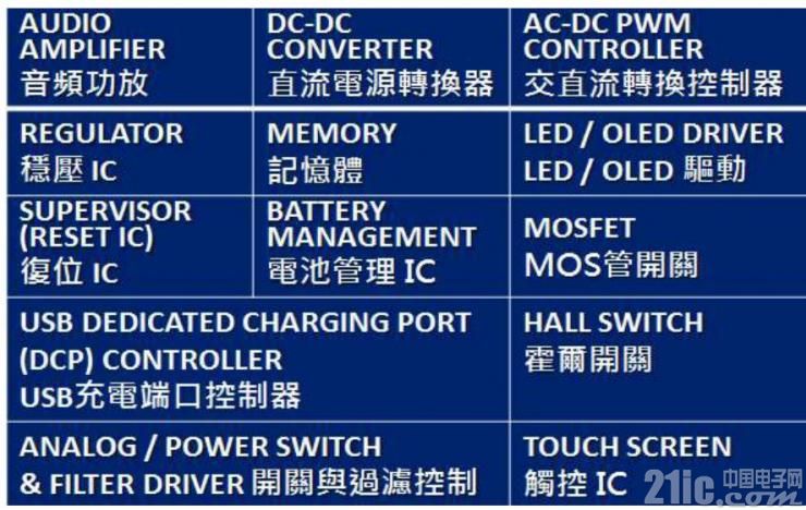 其中電源管理IC主要有音頻功放、直流電源轉(zhuǎn)換器、交直流轉(zhuǎn)換控制器、穩(wěn)壓IC、復(fù)位IC、電池管理IC、觸控IC等等。