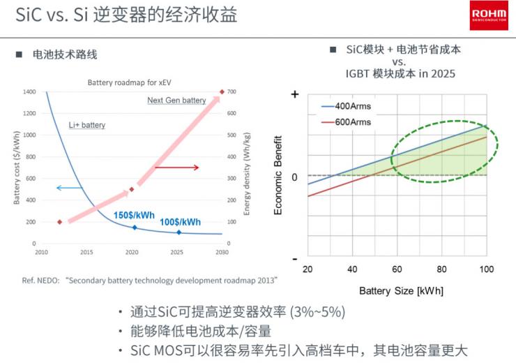 一般來看,碳化硅器件比硅器件價(jià)格高,所以采用碳化硅后終端產(chǎn)品成本相對來說也要高一些。但如果綜合考慮整體成本,事實(shí)上并沒有增加。對于整車廠來說,使用SiC可以提高逆變器效率,從而能夠降低電池容量和成本,平衡一下,結(jié)果是提高了效率而整體價(jià)格并沒有提高。另外,電池的降價(jià)也會(huì)平衡使用碳化硅器件的成本??傮w來看,羅姆認(rèn)為,大約到2021年左右,汽車采用碳化硅后會(huì)帶來整體價(jià)格上的下降。