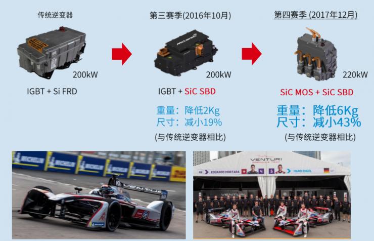 在電動(dòng)方程式大賽中,SiC帶來的優(yōu)勢更是讓人印象深刻。羅姆在2016年第三賽季開始與文圖瑞Formula E車隊(duì)進(jìn)行技術(shù)合作。文圖瑞賽車的逆變器在第二賽季的時(shí)候使用的還是傳統(tǒng)IGBT模塊,在第三賽季的時(shí)候用上了羅姆的IGBT加上SiC的肖特基,在第四賽季時(shí)采用了羅姆的全SiC模塊,所謂全SiC就是SiC的MOS加上SiC的肖特基。結(jié)果顯示,相比第二賽季,第三賽季的逆變器重量減輕了兩公斤,尺寸減少了19%,而第四賽季搭載全SiC之后,重量減輕了將近6公斤,尺寸減少了43%。最直接的好處是重量降下來之后,賽車的行駛距離更長了。