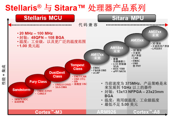 實(shí)際上TI是業(yè)內(nèi)提供最廣泛ARM產(chǎn)品的一家公司,從MCU級(jí)別的ARM到非常高性能的Cortex-A8,均有相應(yīng)的產(chǎn)品推出。此次重磅出擊的產(chǎn)品即為以下兩大系列:Stellaris®與Sitara™ 處理器產(chǎn)品。