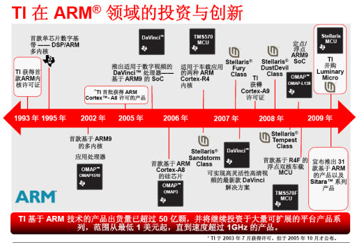 眾所周知,ARM處理器在各個(gè)應(yīng)用領(lǐng)域里面一直在穩(wěn)步發(fā)展,而隨著NXP發(fā)布基于Cortex-M3的LPC1700系列MCU,圍繞著ARM新寵C(jī)ortex內(nèi)核的競(jìng)爭(zhēng)也已進(jìn)入白熱化。以NXP、ST等為代表的ARM構(gòu)架擁護(hù)者深耕該領(lǐng)域多年,而繼收購(gòu)Luminary Micro后TI高調(diào)推出30余款A(yù)RM器件,可見(jiàn)TI旨在深拓MCU領(lǐng)域的決心。德州儀器中國(guó)區(qū)ASP業(yè)務(wù)拓展及應(yīng)用總監(jiān)李儉表示,“TI很早以前就有ARM的產(chǎn)品,但是一直以來(lái)沒(méi)有過(guò)多強(qiáng)調(diào)這些產(chǎn)品是ARM架構(gòu),其實(shí)TI在93年的時(shí)候就已經(jīng)取得了ARM的許可證。同時(shí)TI基本上是業(yè)界第一個(gè)得到Cortex-A8許可證的公司,并且是第一家把Cortex-A8提供到手機(jī)或者是智能手機(jī)的手持平臺(tái)上的公司,同時(shí)今天也是第一家把Cortex-A8架構(gòu)的芯片引入工業(yè)控制領(lǐng)域的公司?!毕聢D為T(mén)I使用ARM歷史的詳細(xì)介紹。
