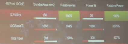 圖:Q:Active數(shù)據(jù)中心解決方案與現(xiàn)有的10GBaseT及10G光纖相比顯著節(jié)約了功耗和空間