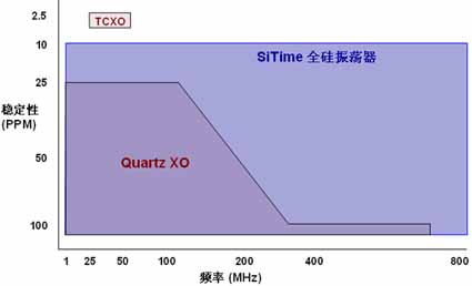 具有上述諸多優(yōu)勢,全硅振蕩器是不是能替代傳統(tǒng)的石英振蕩器呢?目前,SiTime的全硅振蕩器產(chǎn)品線已經(jīng)可以覆蓋800MHz以內(nèi)、10PPM以上的應用,在穩(wěn)定性上超過了石英振蕩器。如下圖所示,和穩(wěn)定性隨頻率升高和下降的石英振蕩器相比,全硅振蕩器在整個頻率范圍內(nèi)均具有極高的穩(wěn)定性。