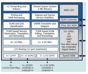 除了Vitesse豐富的運(yùn)營級以太網(wǎng)解決方案,我們有幸提前了解了其最新產(chǎn)品——Caracal系列以太網(wǎng)交換機(jī)VSC7428和 VSC7429。該系列交換機(jī)適用于運(yùn)營商級以太網(wǎng)、無線回傳和光纖到戶 (FTTx) 無源光網(wǎng)絡(luò) (PON) 應(yīng)用。