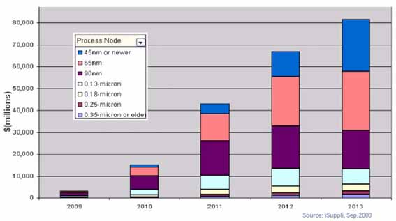正如TI總裁兼CEO Rich Templeton說過的:“隨著世界變得更加數(shù)字化,我們反而需要更多的模擬器件?!钡拇_,,這是一個(gè)有趣悖論,靠DSP一統(tǒng)天下的TI已經(jīng)把模擬看做最為重要的增長(zhǎng)驅(qū)動(dòng)力。據(jù)說排名前25的半導(dǎo)體廠商中已有20家的市場(chǎng)策略將模擬作為今后的重點(diǎn)。模擬市場(chǎng)真的能帶來如此高的利潤(rùn)嗎?iSuppli的數(shù)據(jù)顯示,混合信號(hào)ASSP的收入每年都將有兩位數(shù)的增長(zhǎng),這主要來自于采用90nm以下先進(jìn)制程的器件,而且未來的比重越來越大。換言之,只有走向90nm以下節(jié)點(diǎn),才能從這一巨大市場(chǎng)中獲利。