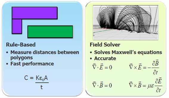 無獨(dú)有偶,在寄生參數(shù)的提取過程中,也存在準(zhǔn)確性和速度難以兼顧的情形。如下圖所示,基于規(guī)則的提取算法(Rule-based)是測(cè)量多邊形之間的距離,計(jì)算速度較快;電場(chǎng)求解器(Field Solver)是要求解Maxwell方程,準(zhǔn)確性更高。但兩種方法都不能兼顧準(zhǔn)確性和計(jì)算速度。
