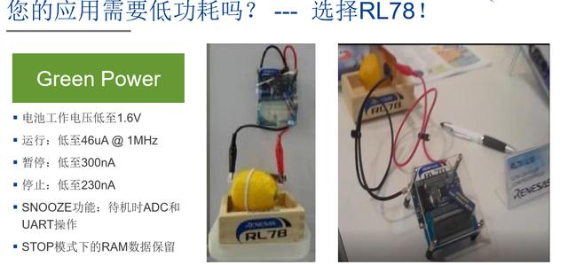 RL78是低功耗應(yīng)用的理想選擇,下圖展示的是只用一個檸檬給10個LED供電,竟然支持了3天的運行,RL78的待機功耗可以低至0.23uA.