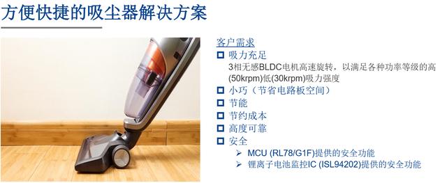 基于RL78/G1F的便攜吸塵器,該方案中RL78/G1F支持120度傳導(dǎo)控制以實現(xiàn)電機高速旋轉(zhuǎn),RL78/G1F可以檢測過流狀況,快速保護電機控制電路,RL78/G1F包括了增強的電機控制模擬功能,配備了多種電壓保護和可選過流保護,在保證安全的同時降低了BOM成本。滿足了用戶對便攜式吸塵器的三大需求:高速運轉(zhuǎn)電機,安全性,低成本。